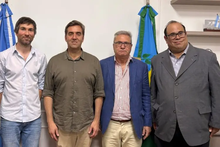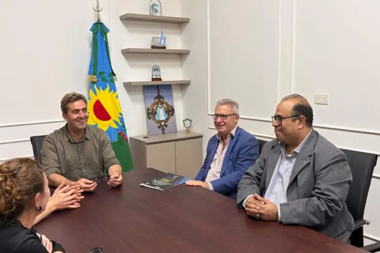 El presidente de APeRA, Fernando Ramírez, y Juan Meri, integrante de la comisión directiva y con desarrollo periodístico en Luján, visitaron al intendente municipal, Leonardo Boto, al jefe de Gabinete. Matías Fernández y a la Directora de Comunicaciones Constanza Mavroyani en la sala de situación del palacio comunal de Luján.